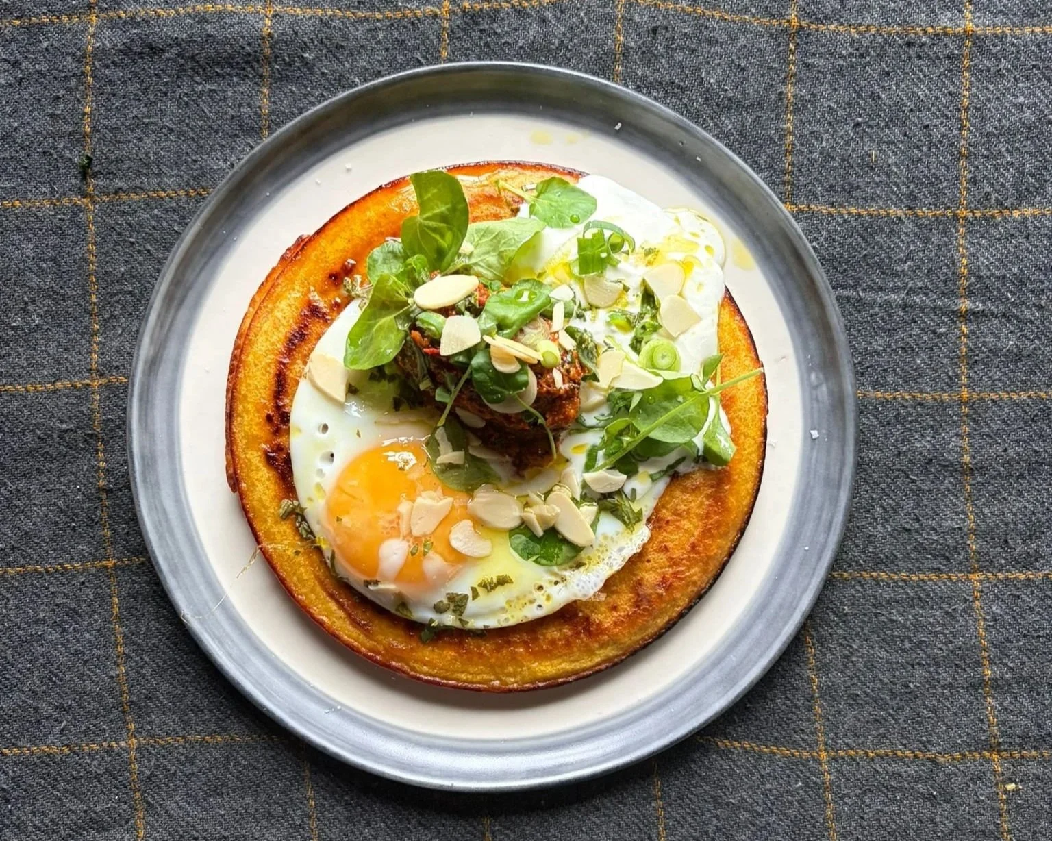 Chickpea pancake, fried egg, romesco sauce, yoghurt, almonds